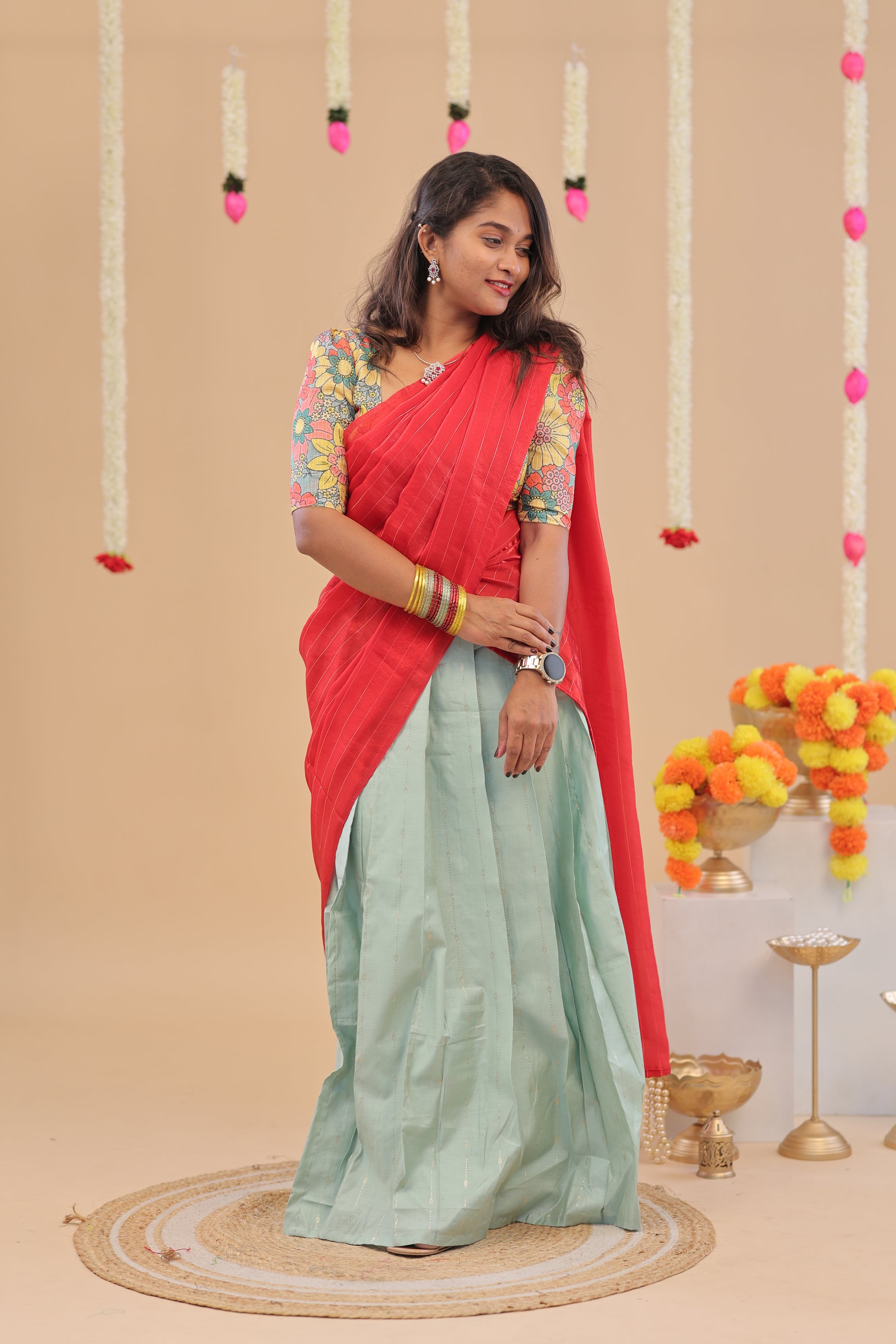 silk skirt with KOTA blouse The fine cotton lining ensures breathable wear while the coordinated colors bring festive charm.