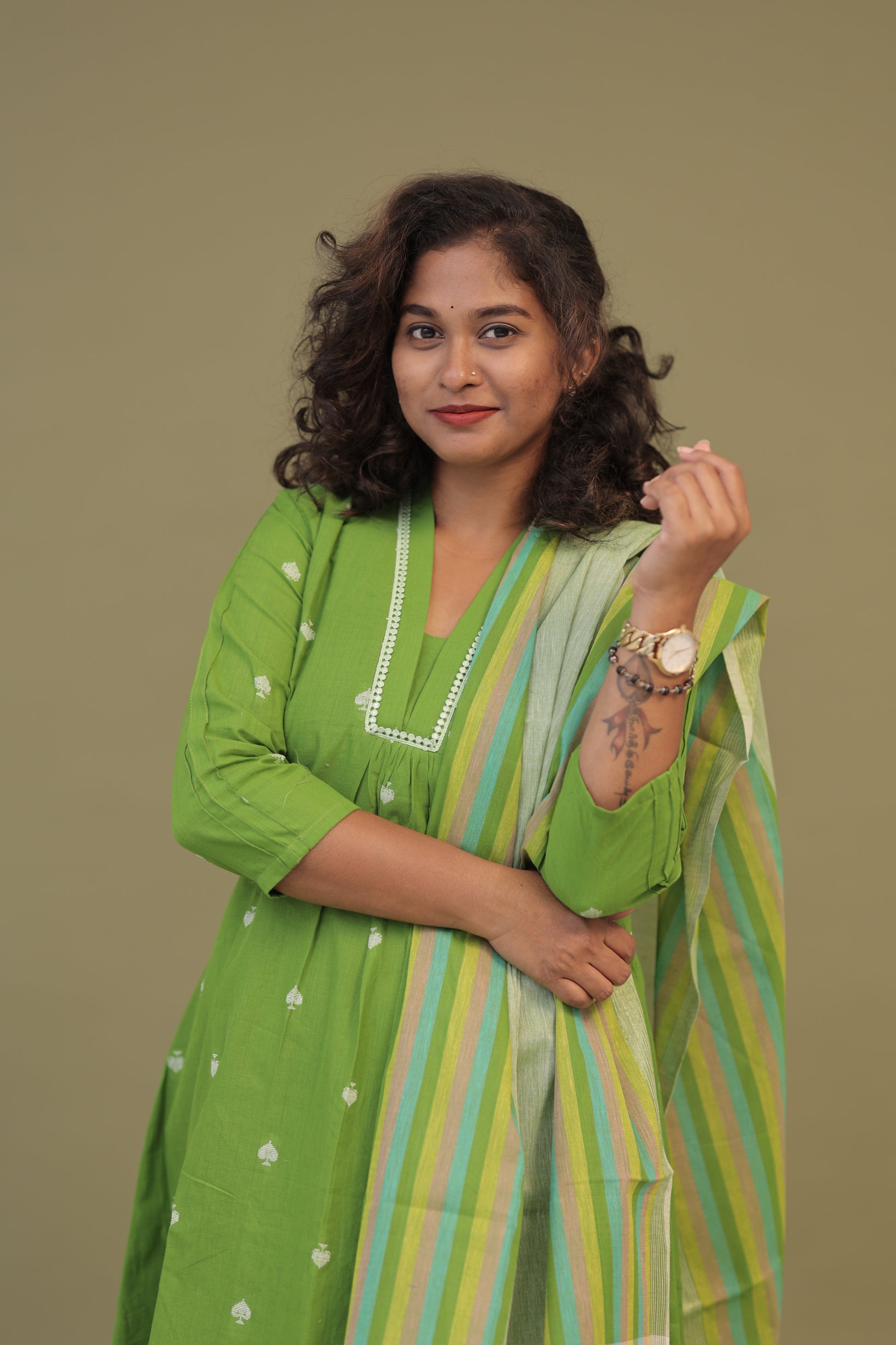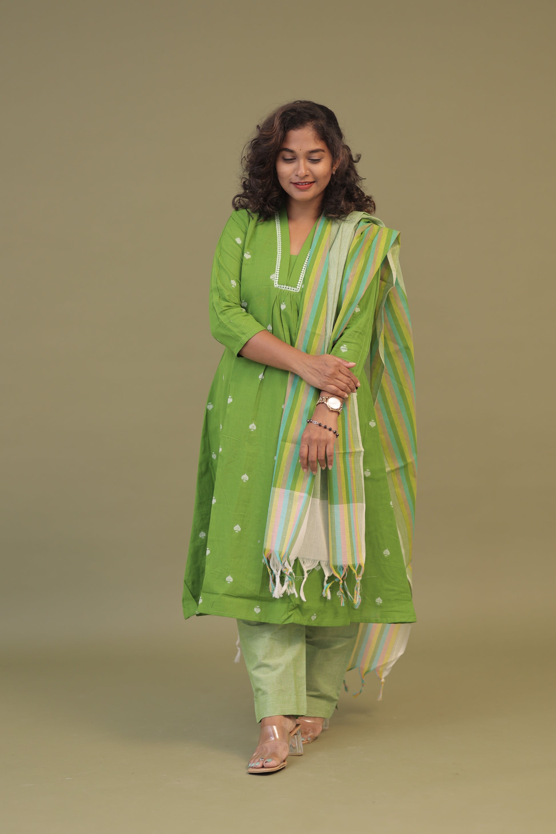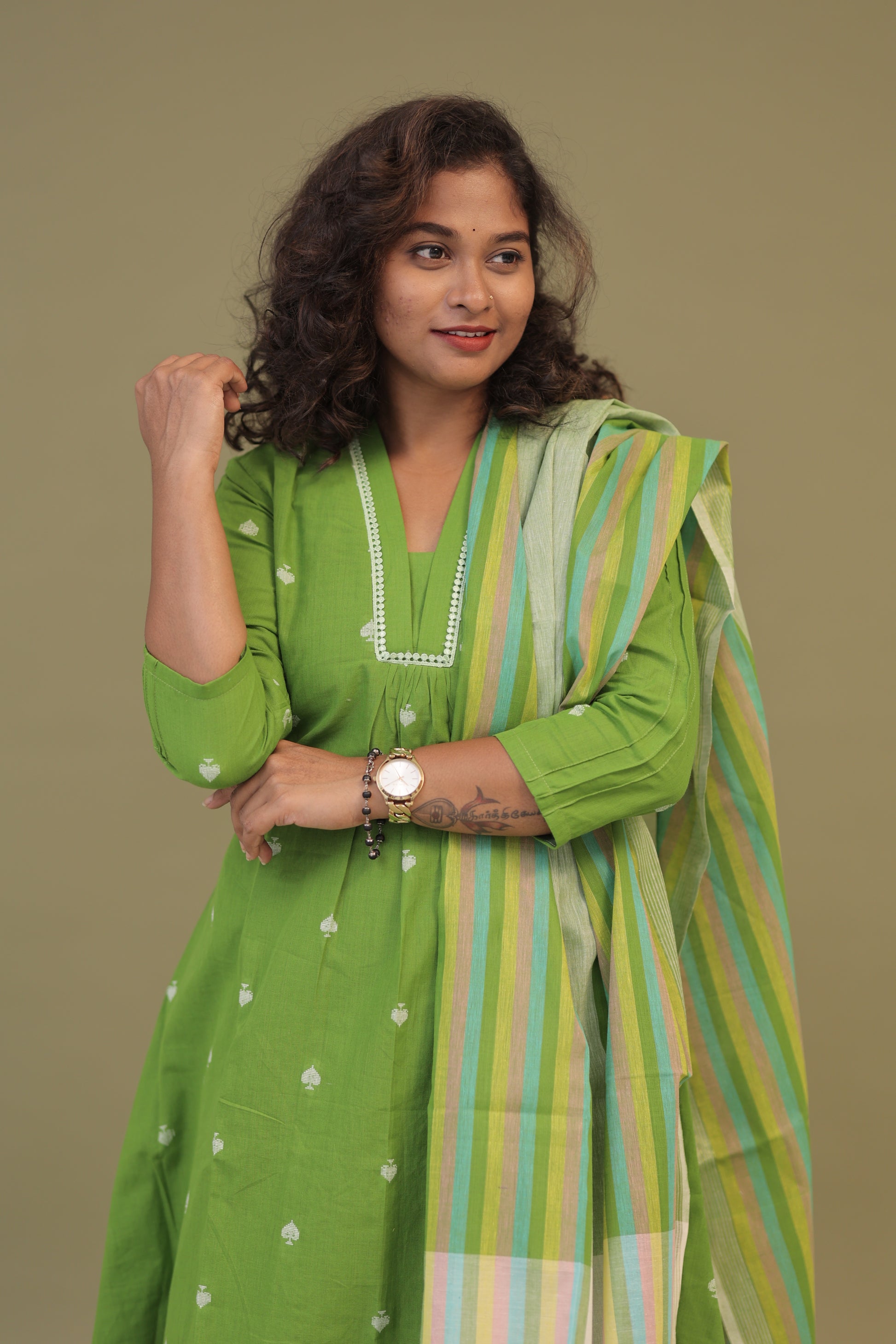 Brighten up your summer with our vibrant parrot perch cotton fabric top, bottom, and dupatta set π! This stunning ensemble features: