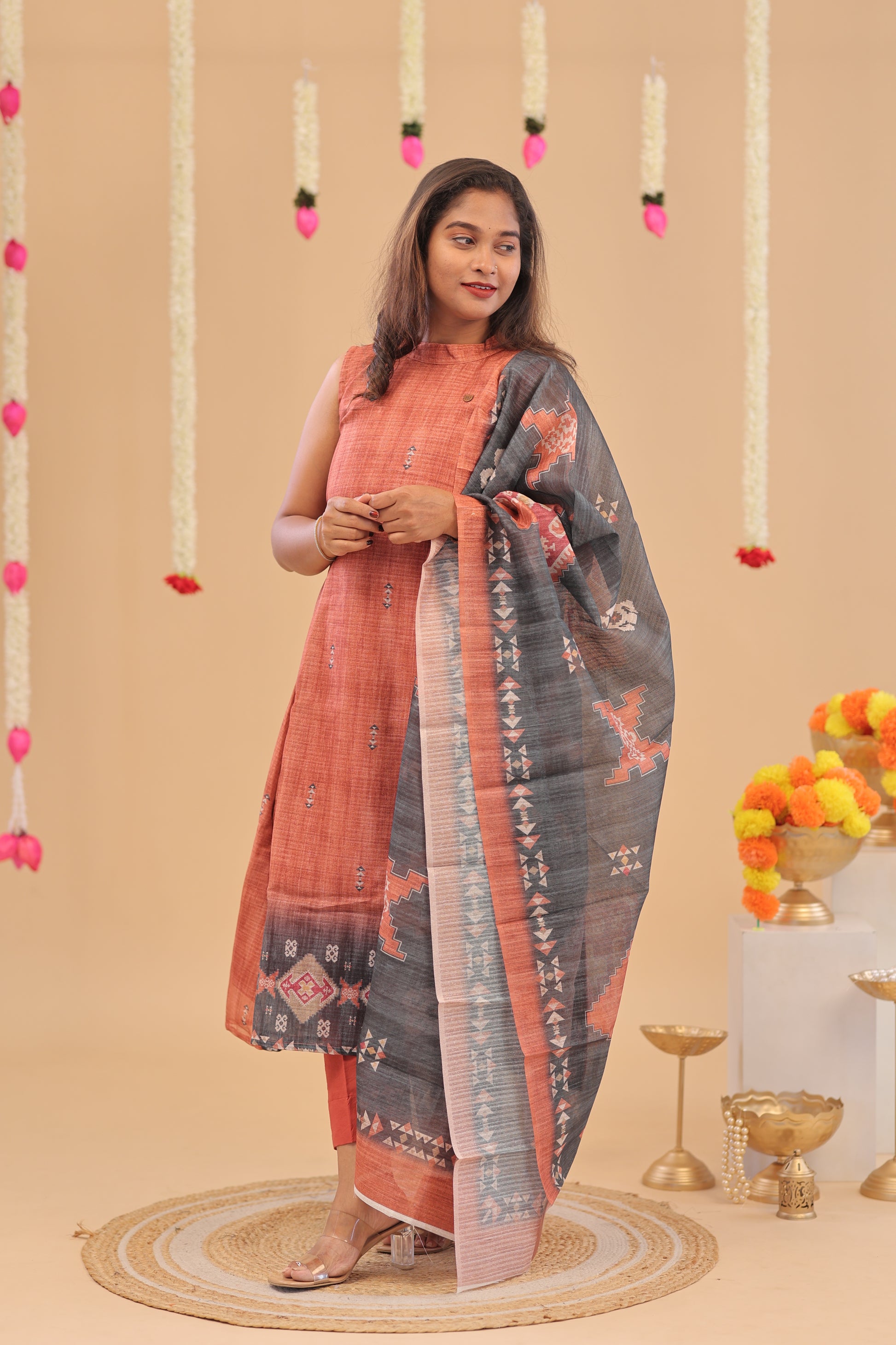 SEMI JUTE - RUST GREY Kurti set